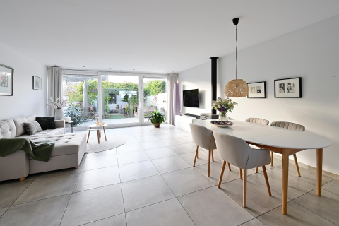Ruime, lichte woonkamer met eetgedeelte, open keuken voorzien van alle nodige apparatuur, separaat toilet en trapkast met bergruimte en wasmachine-aansluiting. De achtertuin sluit naadloos aan op het parkje en biedt vrij uitzicht over het water.